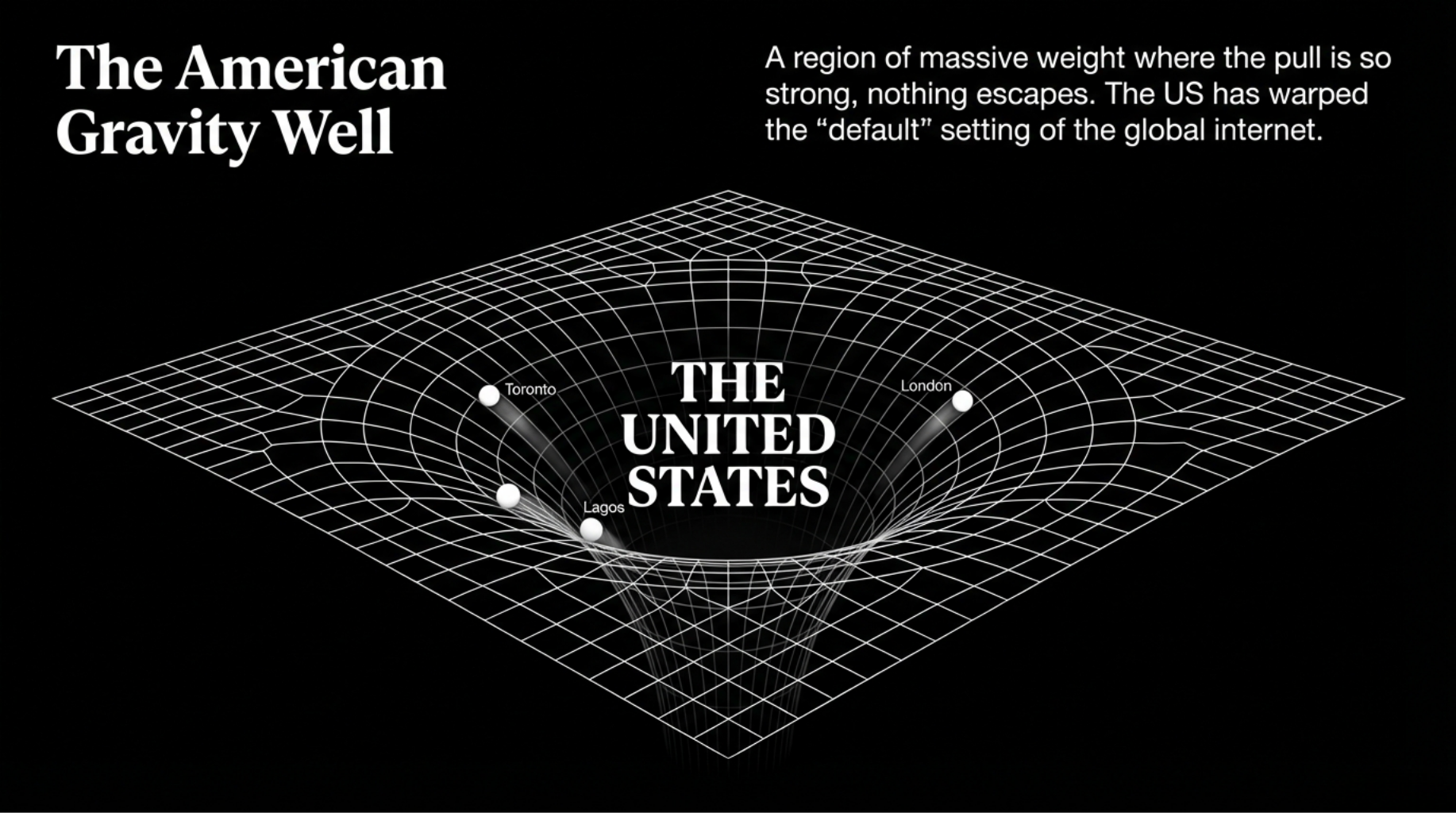 There is a term in physics for the region surrounding a body of massive weight where its pull is so strong that nothing, not even light, can escape. We call it a gravity well. In the digital age, the United States has become a cultural and political gravity well of such immense proportions that it has effectively warped the "default" setting of the global internet.