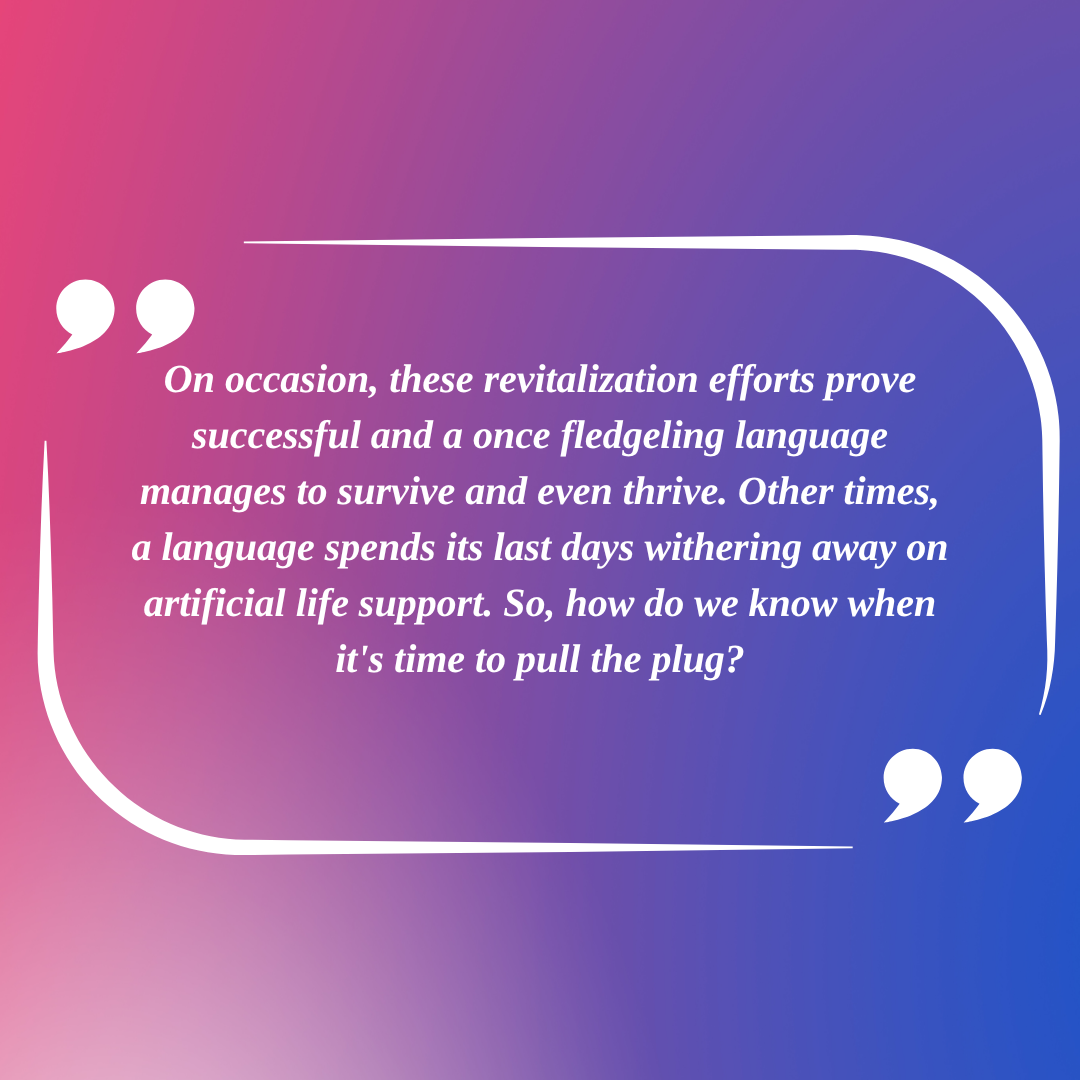 But as with all living things, languages have a life cycle. They're born, they evolve, and sadly, they can die. It's estimated that more languages have died throughout history than are spoken today. Usually, when a language approaches the end of its life cycle (usually signalled by the fact that there are only a handful of elderly speakers left), a variety of language revitalization initiatives get launched as a last-ditch effort to prevent the inevitable. These initiatives might be education campaigns, language classes aimed at younger community members, or the promotion of cultural art forms like stories or songs done in the language. Occasionally, these revitalization efforts prove successful, and a once fledgeling language manages to survive and even thrive. Other times, a language spends its last days withering away on artificial life support. So, how do we know when to pull the plug?